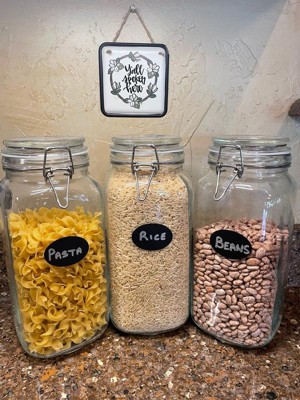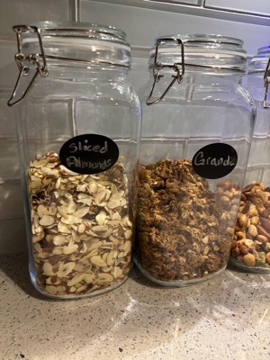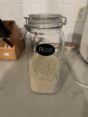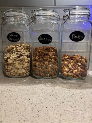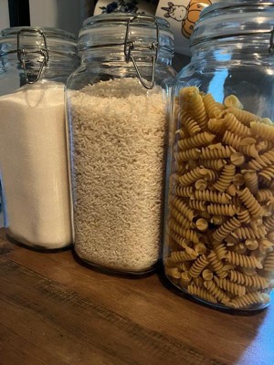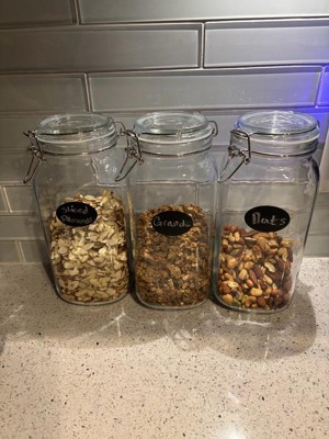 [This review was collected as part of a promotion.] Loved these glass storage jars. Great for storing flour, grains, or anything that needs a tight seal. They are very large and fit a lot. A whole bag of rice only takes up half the container. They come with very cute aesthetic black labels, but I wish they also came with some kind of pen to write on them. I used chalk, but that rubs off, so I will have to get some kind of special light marker. My only other issue is the seal snaps a little bit and I feel like you have to be careful not to hurt your finger when closing. Otherwise, they came packaged very nicely and I would overall recommend.