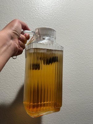 - 67oz GLASS PITCHER WITH LID FOR POURING, AND ONE SPARE! Just in case one of the kids runs off with a lid, or the refrigerator somehow eats it, this 2qt pitcher comes with an extra! So, no matter what - you can keep using your JoyJolt pouring pitcher without pouring drinks down the side of your glass.