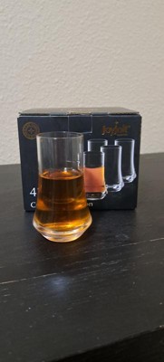 [This review was collected as part of a promotion.] This pack of four shot glasses are very different and unique. The shot glasses are crafted with a unique look and are easy to handle. The bottom of the shot glasses is slight larger and works great for mixed shots. We uses these shoy glasses for regular shots and to make mix shot drinks too. I think the size of the shot glasses is makes the easy to handle and drink from. The top or the glasses is narrow and keeps the drink from being spilt out when moving