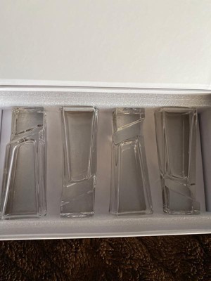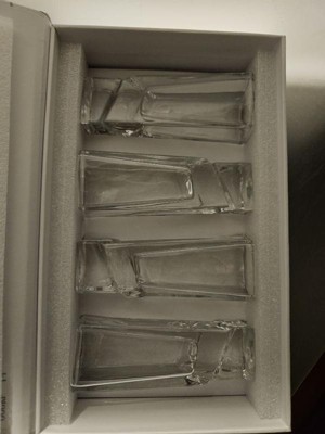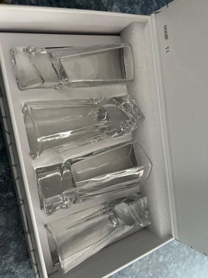 [This review was collected as part of a promotion.] I just received these and they’re just gorgeous. The beautiful edge design is so fashion forward and edgy and art deco. I love the design. I can’t wait to use them, but I also would like to use them for a very decadent like rich dessert just because we look so cool putting them in here so Four of them would be nice but it would be even better but then as a shot, Glass goes that might be too many very heavy. Very good glass and the package is just beautiful. It’s so nicely packaged that you could easily give this as a gift of very nice high-end gift.