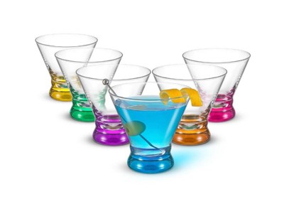 [This review was collected as part of a promotion.] I received a set of 6 JoyJolt Colored Martini Glasses, and I adore them! They are so cute! Each one is a different color at the base. They feel great in my hand, and are a good size and thickness. They are very sturdy. I love using them for drinks other than martinis as well. They are cute for small get togethers or parties. Overall, I recommend them!