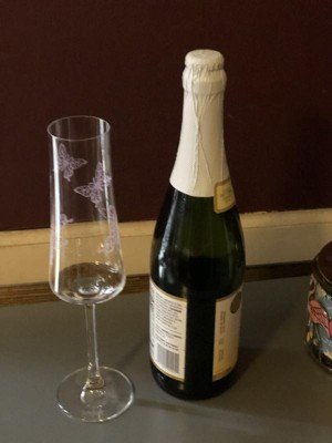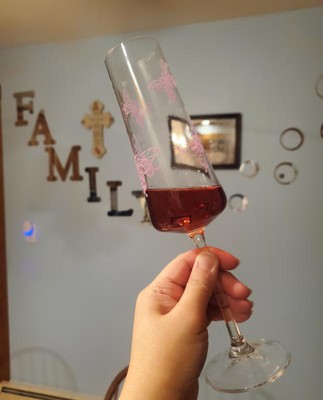 [This review was collected as part of a promotion.] I had a friend over the other night and she bought a bottle of champagne and I figured this would be the perfect time to bring out my new glasses. In awe we both were!! The elegance of the butterflies and the shimmer of the way the light it the glass was stunning. Fits perfect in hands and just overall a very well made champagne glass. Also, I love to have a glass of champagne when soaking after a long days work with a candle and this fits perfect in my bath nook!!! The only thing is that I should have gotten the bigger size!!!!