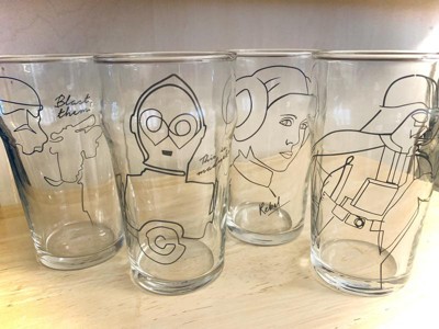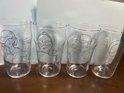 - A NEW HOPE FOR GLASSWARE: These pint glasses bring your favorite Star Wars characters to life, featuring artfully-drawn illustrations of Darth Vader, Princess Leia, C-3PO, and a Stormtrooper embossed on the glass front alongside memorable quotes from the Star Wars films.