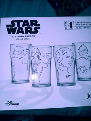 - PLENTY OF ROOM TO POUR: The Star Wars Striking Sketch Art Drinking Glasses hold up to 19oz of your favorite beverage. Pour yourself a standard pint with plenty of extra room for ice or foam on top.