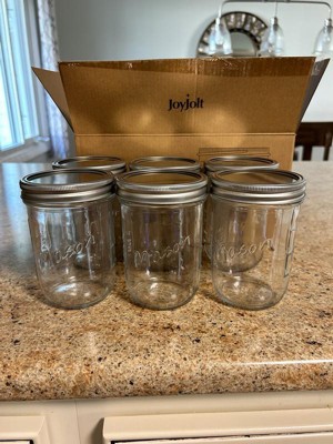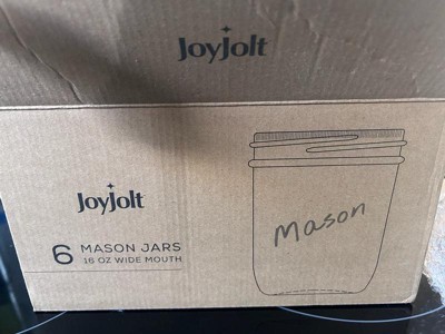 JoyJolt Mason Jars 16 oz Wide Mouth Large Mason Jars. Lead-free glass pint canning jars with tinplate lids, bands, labels and handy measurements on the side! For food storage, 16 ounce batches of pickles, 16oz glass jar oatmeal container or overnight oats containers with lids, a half liter of juice or big half qt spice jar order your 6-Pack of 16oz Mason Jars (1pt Mason Jars) from JoyJolt.
