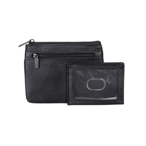 Naturally Milled Butter soft Leather Hudson Pik-Me-Up I.D. Coin / Card Case features a top zip main compartment, pull-out I.D. window with credit card slots, front zipper pocket, and back I.D. window and slip pocket.