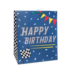 Thinking of a fast way to wrap gifts? Well, this Jumbo Kids' Birthday Bag from Spritz just sped up the process. Perfect for large/x-large gestures, this portrait oriented gift bag features some serious space and racing inspired graphics, a birthday wish, and brilliant silver metallic inks on navy blue. Made of quality matte laminated paper, the bag has strong ribbon handles for easy carrying and can be folded for convenient storage and future use/re-use. Just slide in some colorful tissue to brighten up your kid's day.