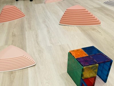● and more! RockSteady Balance Stepping Stones are designed so they will not overturn and with the non-slip material on the perimeter of each stone, they can be used on carpet, grass, or smooth surfaces. This system helps children determine distance and height, and trains important muscles needed for stability while walking, jumping, and running. Perfect for use in day cares, schools, playgrounds, and homes.
