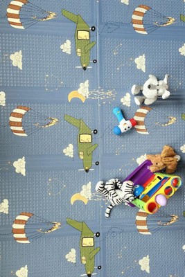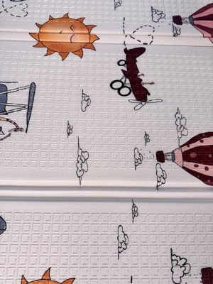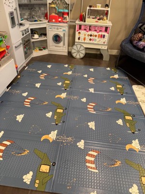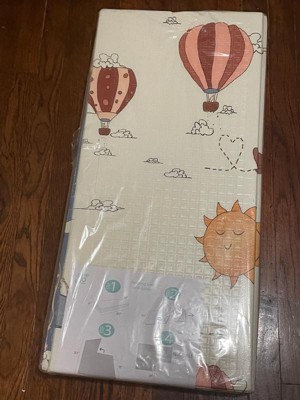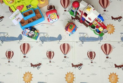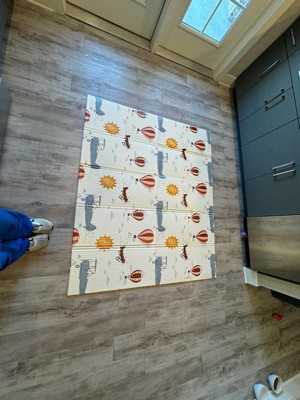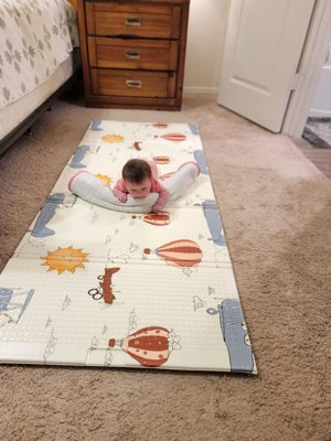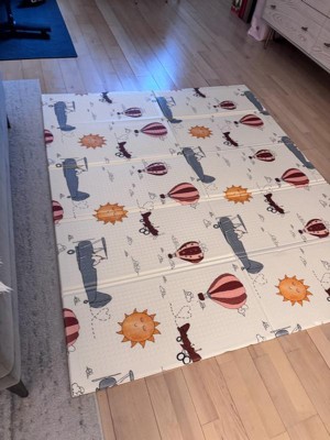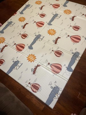 [This review was collected as part of a promotion.] I received this product for free in exchange of my honest opinion. the JumpOff Jo "Take Flight" play mat. The mat is generously sized at 70" x 59", providing ample space for crawling, tummy time, and play. Its reversible design features charming airplanes and hot air balloons on one side, and a more subtle pattern on the other, making it a versatile addition to our living room. It's also foldable, allowing for convenient storage when not in use. The JumpOff Jo "Take Flight" play mat is a versatile and functional play space for our child. With its reversible design, soft foam surface, and waterproof material, it's perfect for playtime, tummy time, and cleaning up spills. It's also foldable, allowing for convenient storage when not in use. Overall, the JumpOff Jo "Take Flight" play mat combines functionality with style, creating a safe and enjoyable space for our child to explore and play.