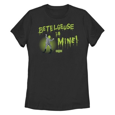 - Strut your stuff with this stylish new juniors' t-shirt that is perfect for every occasion! Featuring Beetlejuice standing backward alongside the phrase: "Betelgeuse Is Mine" printed in slimy green lettering across the front.
