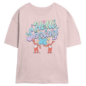 • What a special spring day you'll have with this stylish new juniors' skimmer t-shirt! Featuring the mischievous Thing 1 and Thing 2 captivated by colorful butterflies and the message: "Hello Spring" printed in a gradient font that fades from blue to purple.