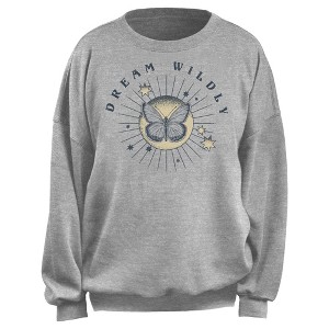 • Strut your stuff with this stylish new juniors' oversized sweatshirt that is perfect for every occasion! Featuring the sun with a butterfly and the words: "Dream Wildly," across the front.