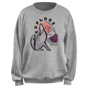 • Strut your stuff with this stylish new juniors' oversized sweatshirt that is perfect for every occasion! Featuring the text: "Explore Wilderness Calls," a Wolf howling at the moon, and a mountain range scene across the front.