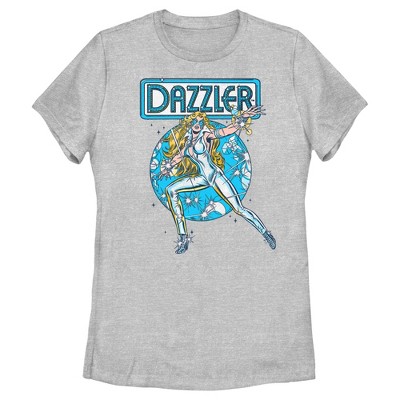 • Strut your stuff with this stylish new every day juniors' t-shirt that is perfect for every occasion! Featuring Dazzler in a fighting pose against a circle of gleaming beams of light and different shapes in the background with her logo at the top.