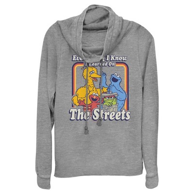 • Strut your stuff with this stylish new juniors' cowl neck sweatshirt that is perfect for every occasion! Featuring Big Bird, Cookie Monster, Elmo, and Oscar the Grouch with the text: "Everything I Know I Learned on the Streets," across the front.