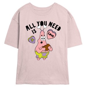 • Elevate your Valentine's Day look with this adorable juniors' skimmer t-shirt that will surely steal hearts! Featuring the playful Patrick Star dressed for the holidays wearing a heart bopper as he munches on a heart-shaped chocolate, along with the phrase: "All You Need Is Love" written across the top.