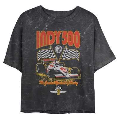 - You are sure to feel like a racing legend with this stylish new juniors' baby t-shirt! Featuring a race car illustration surrounded by checkered flags, along with the iconic Indy 500 logo and the legendary phrase "The Greatest Spectacle in Racing" across the front.