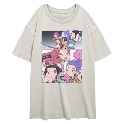 • Unleash your inner idol with this eye-catching juniors' oversized t-shirt perfect for concerts, hangouts, or everyday slaying! Featuring striking monochromatic panels portraying Huntrix's members, Rumi, Mira, and Zoey printed across the front.