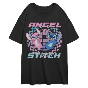 Get groovy with this officially licensed Juniors' Oversized Graphic T-Shirt! This awesome design features Angel and Stitch dancing like nobody's watching! This dazzling tee turns up the volume with a bold gold graphic, disco wall shimmer, and a vibrant checkered background, along with the names 'Stitch' and 'Angel' in bright pink and blue. It's a cosmic combo of cute and cool. Perfect for fans of Lilo & Stitch, Y2K fashion, kawaii vibes, and oversized streetwear, this comfy gear is ready to stitch up your style game and angel-ify your wardrobe!