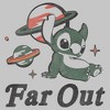 Ohana means family, and family means no tee gets left behind! Find the perfect style for your family with this new Juniors' Far Out T-shirt! This adorable design features a distressed print of Stitch sitting down and looking cute with planets and stars all around him and the text "Far Out" in black lettering below him. Celebrate a certain alien, otherwise known as Experiment 626, in style with new hilarious apparel for the whole family from the movie!