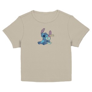 • Rep the fashionista in you with this stylish new juniors' baby tee that is perfect for every occasion! Featuring an adorable graphic of Stitch hugging Scrump across the front.