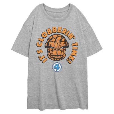 • Clobber your closet's fashion with this juniors' oversized t-shirt that is perfect for every occasion! Featuring the Thing's iconic face encircled by his iconic catchphrase: "It's Clobberin' Time!" and the number four printed in matching orange lettering.
