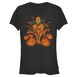 • Wear your Halloween spirit all season long with this juniors' t-shirt that is perfect for everything from haunted hayrides to horror movie marathons! Featuring Spider-Man and carved pumpkins printed across the front.