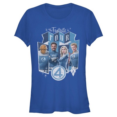 • Experience the dawn of a universe with this chic juniors' t-shirt that is perfect for work, brunch, or battling cosmic threats! Featuring comic book versions of Mr. Fantastic, Invisible Woman, The Thing, and Human Torch standing tall and proud front and center, with the classic The Fantastic Four logo above them.