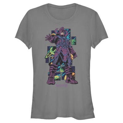 Experience the dawn of a universe with this chic juniors' t-shirt that is perfect for work, brunch, or battling cosmic threats! Featuring the mighty Galactus striking his iconic hand-reaching pose amid swirling planets and the statement, “Galactus Devourer of Worlds,” printed in eye-striking yellow and blue letters.