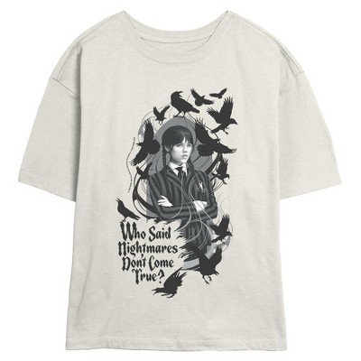 • Own the darkness in style with this unique juniors' graphic skimmer tee design from Wednesday.