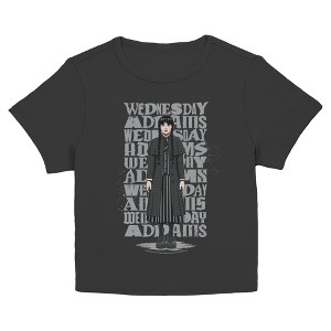 • Walk on the dark side of fashion with this stylish new juniors' baby tee that is perfect for every occasion! Featuring a cartoon-style Wednesday standing across the front, delivering her iconic stare, with her name printed and repeated behind.