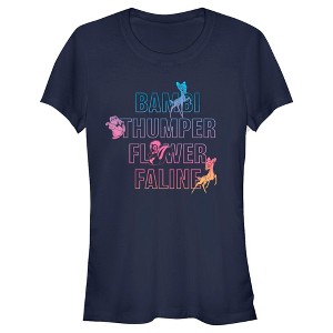 Come join Bambi and his friends as they explore their forest home in this officially licensed Disney Bambi Neon Name Stack Juniors' Graphic T-shirt! This tee features Bambi and Faline the deer, Thumper the rabbit, and Flower the skunk with a stack of their names in colorful big bright neon letters in the background. Show your love for this Disney classic film with fun new Bambi apparel, perfect for everyone!