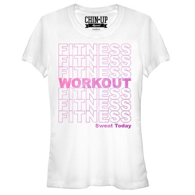 Walk the runway? More like walk the treadmill with the Chin Up Not the Runway White T-Shirt. Sweat it out with this fitted white tee that reads "It's the Gym…Not the Runway" in distressed black and purple print.