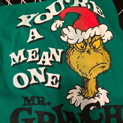 Welcome to the fantastical world of Dr. Seuss! Celebrate the most wonderful time of the year alongside the beloved childhood classic books and movies from every generation with fun new officially licensed apparel for the entire family! This Juniors' Dr. Seuss Christmas Grinch You're a Mean One Portrait Graphic T-Shirt features the text: "You're a mean one Mr. Grinch," with Grinch himself across the front. Get ready for the rhyming and whimsy of Seussville with these classic tees today!