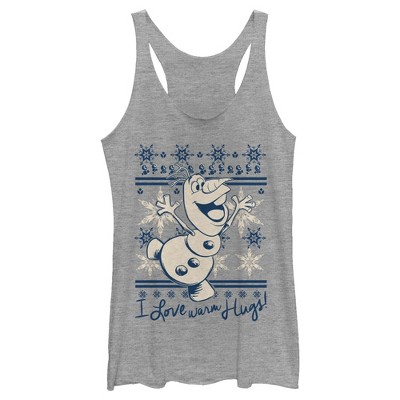 Olaf's here to help you stay warm with hugs and the Disney Frozen Christmas Warm Hugs Juniors' T-Shirt! Olaf dances across this Christmas shirt that reads "I love warm hugs!" in blue and white text.