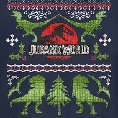 The holiday season just got a dose of dinosaur thanks to the Jurassic World Christmas Sweater Print T-Shirt! The Jurassic World logo is featured next to Pteranodons, velociraptors, and a T rex or two creating a holiday sweater-style print on the front of this festive Jurassic World tee shirt.