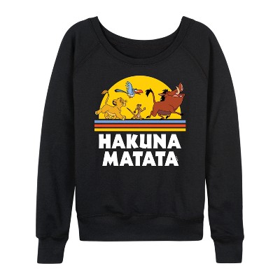 Wear the Lion King Hakuna Matata Means No Worries Juniors' Cowl Neck Sweatshirt and have no worries for the rest of your days! Young Simba, Timon, and Pumbaa dance across this Lion King sweatshirt that reads "Hakuna Matata Means No Worries" in black text.