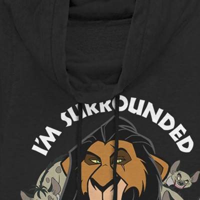 Take over the Pride Lands with the Lion King Scar Surrounded by Idiots Juniors' Cowl Neck! Scar and his hyena allies are printed next to white letters that spell out "I'm Surrounded By Idiots" on the front of this cool black Lion King cowl neck.