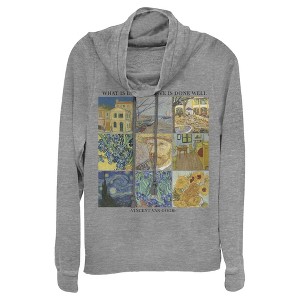Take your everyday style to the next level with this lovely new Juniors' Art Grid Racerback Cowl Neck Sweatshirt from Lost Gods! This easy-breezy heather grey sweatshirt features Van Gogh's most famous paintings like Starry Night, Sunflowers, The Bedroom, The Yellow House, and more adorned across the front in a grid. Grab this new graphic sweatshirt today and make everything from workouts to running errands, or even just lounging around the house a little extra chic!