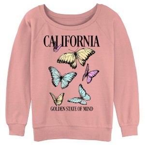 • Strut your stuff with this stylish new juniors' raglan sweatshirt that is perfect for every occasion! Featuring yellow, blue, and pink, butterflies with the text: "California Golden State of Mind," across the front.