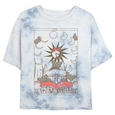 • Strut your stuff with this stylish new juniors' crop t-shirt that is perfect for every occasion! Featuring a tarot card of a butterfly with planets, moons, suns, stars, mushrooms, and flowers across the front.