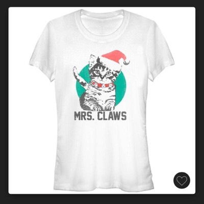 The newest member of Santa Claus' family is the Lost Gods Mrs Claws Christmas Kitten White T-Shirt! A cute little kitten wearing bells around her neck and a Santa hat is printed next to "Mrs. Claws" on the front of this festive and funny Christmas shirt.