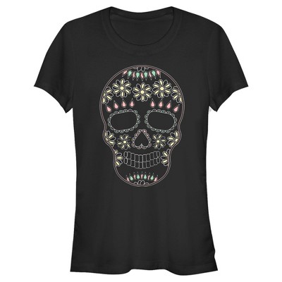 • Skeletons may not wear clothes… but this one is still feeling fashionable with a cute lace pattern decorating its face across the front of this fitted juniors' t-shirt.