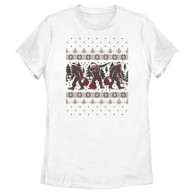 • Strut your stuff with this stylish new Christmas juniors' t-shirt that is perfect for the holidays! Featuring a fun ugly sweater design with snowflakes, trees, and Bigfoot, aka Sasquatch, wearing a Santa hat and dabbing across the front.