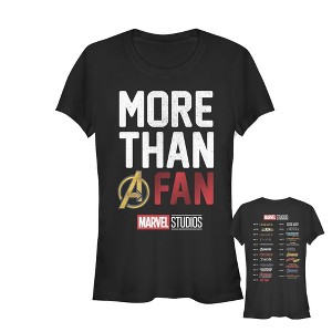 If you are more than a regular old Marvel fan, then you need the Marvel More Than a Fan Juniors' T-Shirt! This awesome front-and-back tee shows off all the Marvel movie releases from Iron Man to Spider-Man: Far From Home.