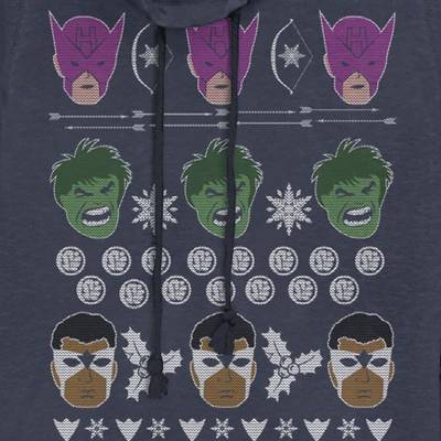 The Avengers team up to save the world and sometimes just to go dashing through the snow with the Marvel Avengers Ugly Christmas Sweater Juniors' Cowl Neck Sweatshirt! Join in the winter fun with this jolly Marvel sweatshirt that features some of your favorite Avengers like Hawkeye and the Hulk in an ugly Christmas sweater style pattern.