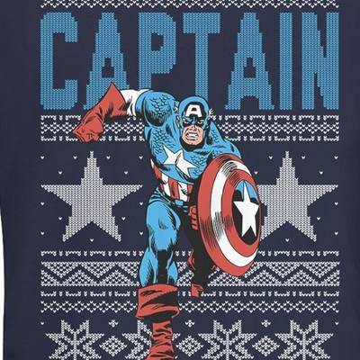 On the first day of Christmas, Marvel gave to me a Marvel Captain America Star Ugly Christmas Sweater style! Start your holiday off right with this awesome Captain America design that portrays Steve Rogers framed by snowflakes in an ugly Christmas sweater style.