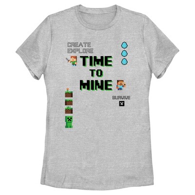 Whether you're building something amazing, battling mobs, or playing with friends, show your love for everyone's favorite game in this officially licensed Minecraft Small Steve and Alex Juniors' T-Shirt featuring a graphic of cute pocket-size Steve, Alex, and Creeper with the phrase "Time To mine" printed across the front in black along with "Create Explore". Start your adventure, explore the world, discover places, and craft your style with this new tee today in this amazing world of endless possibilities!