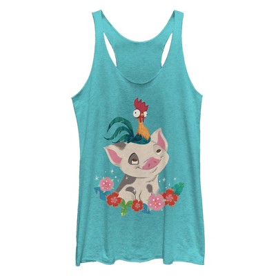 It's your lucky day! Not because you found a "Boat Snack" but because you found the Disney Moana Pua HeiHei Flowers Juniors' Juniors' Racerback Tank Top! A colorful graphic of HeiHei and Pua, Moana's loyal chicken and pig, is printed with flowers across this awesome Moana shirt.