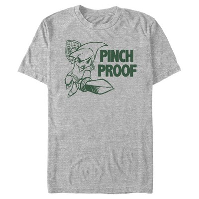 It's dangerous to go alone on St. Patrick's Day, take this Nintendo Legend of Zelda Link Pinch Proof Juniors' Tee! Link is encircled by "Pinch Proof" on this funny Nintendo tee.